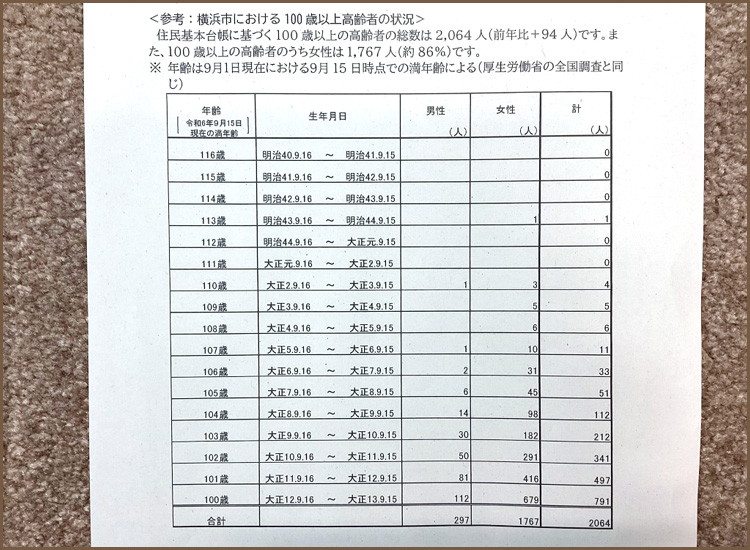鶴見区内の老人ホームには、横浜市で最高齢者(113才)がお住いになっています。現在、市内での100才以上の高齢者は2064名おられ、うち1767名が女性です。