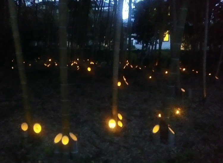 庭園に竹とうろうの明かりが灯り、幻想的な空間になります。