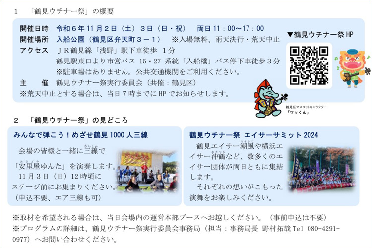 鶴見ウチナー祭は、沖縄にゆかりのある店舗などが集う “沖縄の食と文化の祭典”です。ステージでは、沖縄に関連の深いアーティストや団体を中心に、沖縄民謡やエイサーなど30以上のパフォーマンスが予定されています。区民祭りにならぶ鶴見の風物詩となっています。