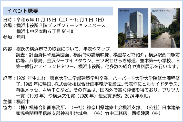 横浜市役所では、本年6月に亡くなられた建築家・槇文彦氏の追悼展示を開催します。