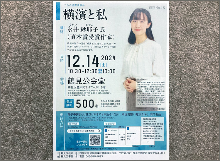 鶴見図書館が主催する「つるみ読書講演会」が開催されます。今回は直木賞受賞作家の永井紗耶子さんを迎えて、「横濱と私」と題しての講演会となります。横浜が舞台となっている横濱王を読んでみたいと思います。
