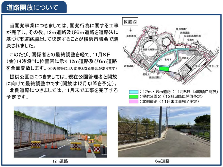 花月園競輪場の跡地には、鶴見花月園公園(約4.5ヘクタール)が整備されています。11月8日には新設道路(幅員12m道路及び幅員6m道路)が全面開放され、あとは住宅等の建設が進められます。