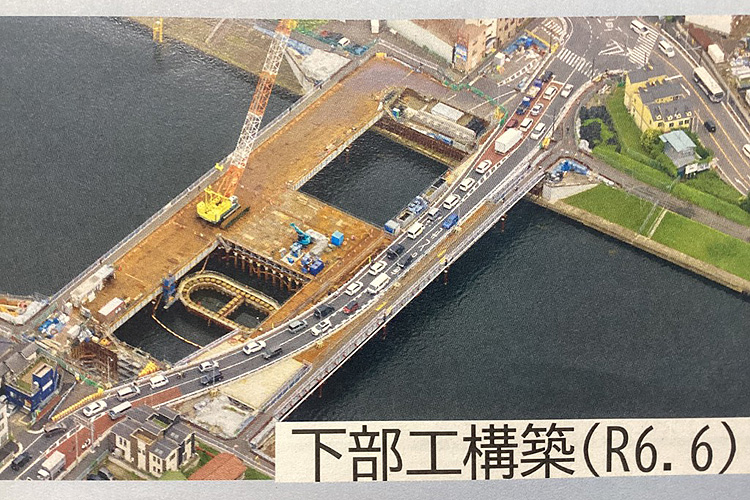 2029年の供用開始に向けて、末吉橋の架け替え工事が進んでいます。仮橋をかけて、交通を切り替えながらの複雑な工程となっています。橋長108m、幅員18.8mという大規模な橋梁工事となりますが、最後まで無事故・無災害での工事管理が求められます。