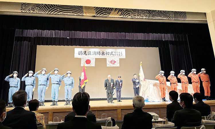 新年恒例の鶴見区消防出初式が開催されました。これまでは屋外会場でしたが、鶴見公会堂での開催となりました。