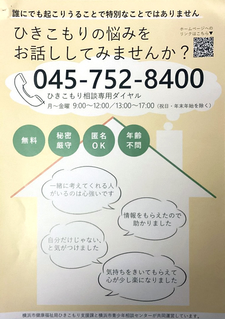 横浜市では、ひきこもりで悩んでおられるご本人やご家族からの相談を受ける「ひきこもり相談専用ダイヤル(045-752-8400)」を運用しています。