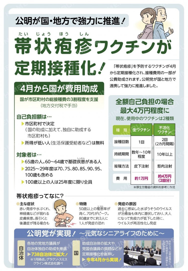 これまで議会での質疑や予算要望等を重ねてきた帯状疱疹ワクチンの定期接種化が実現する運びとなりました。