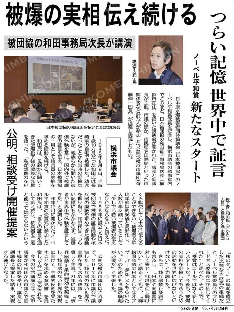 横浜市会では議長・副議長の主催によるノーベル平和賞受賞記念講演会が開催されました。被爆の実相を伝える貴重な講演会となりました。被爆者の平均年齢も85歳を超え、毎年6000から10000名が亡くなっておられ、平和への想いをどう伝え継承して行くのかが問われています。