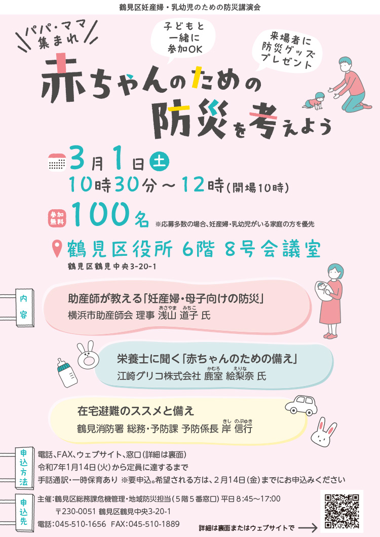 鶴見区役所では「赤ちゃんのための防災をかんがえよう」とのテーマで防災講演会を開催します。興味・関心のある方をはじめ、妊産婦・乳幼児のいる世帯やその親族、地域防災拠点の運営委員や赤ちゃん訪問員の皆様にご参加頂ければと思います。