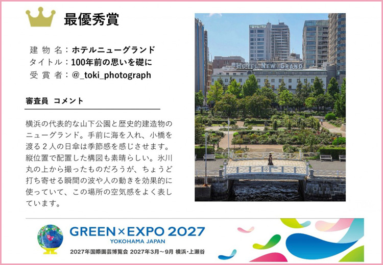 横浜市では、公共建築の魅力発信や市内建築物の新たな魅力を発掘する取組として、Instagramを活用したよこはま建築フォトコンテストを開催しています。今回は「横浜×建築×花や緑」のテーマで1024点の応募作品から入賞・佳作15点が決定しました。3月15日から27日まで横浜市庁舎で展示されます。