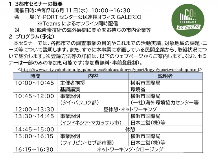 横浜市では、タイ・バンコク、インドネシア・マカッサル、フィリピン・セブの3都市との都市間連携事業として、脱炭素化に向けた現地のニーズや事業予定等を紹介するセミナーを開催します。