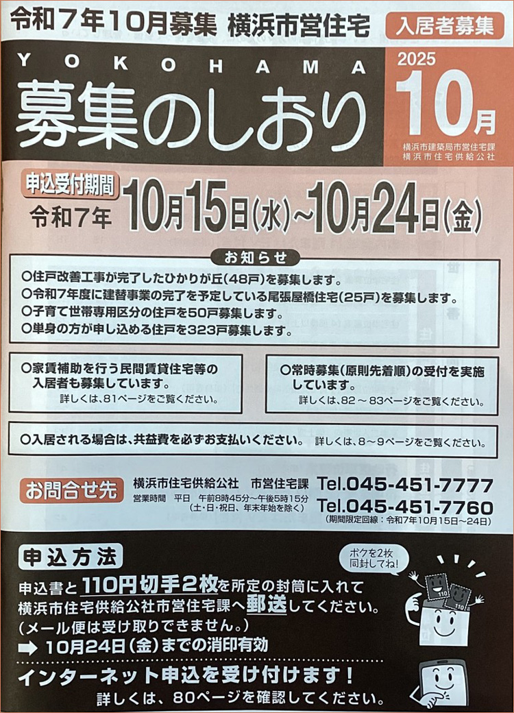 令和7年10月の横浜市営住宅の入居者募集が始まりました。毎年4月と10月の2回に渡って定期募集が実施されています。相変わらず鶴見区内での募集戸数は少なく、倍率もかなり高くなっている状況です。
