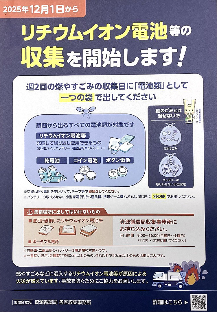 横浜市では12月からリチウムイオン電池等の集積場所での分別収集を開始します。
