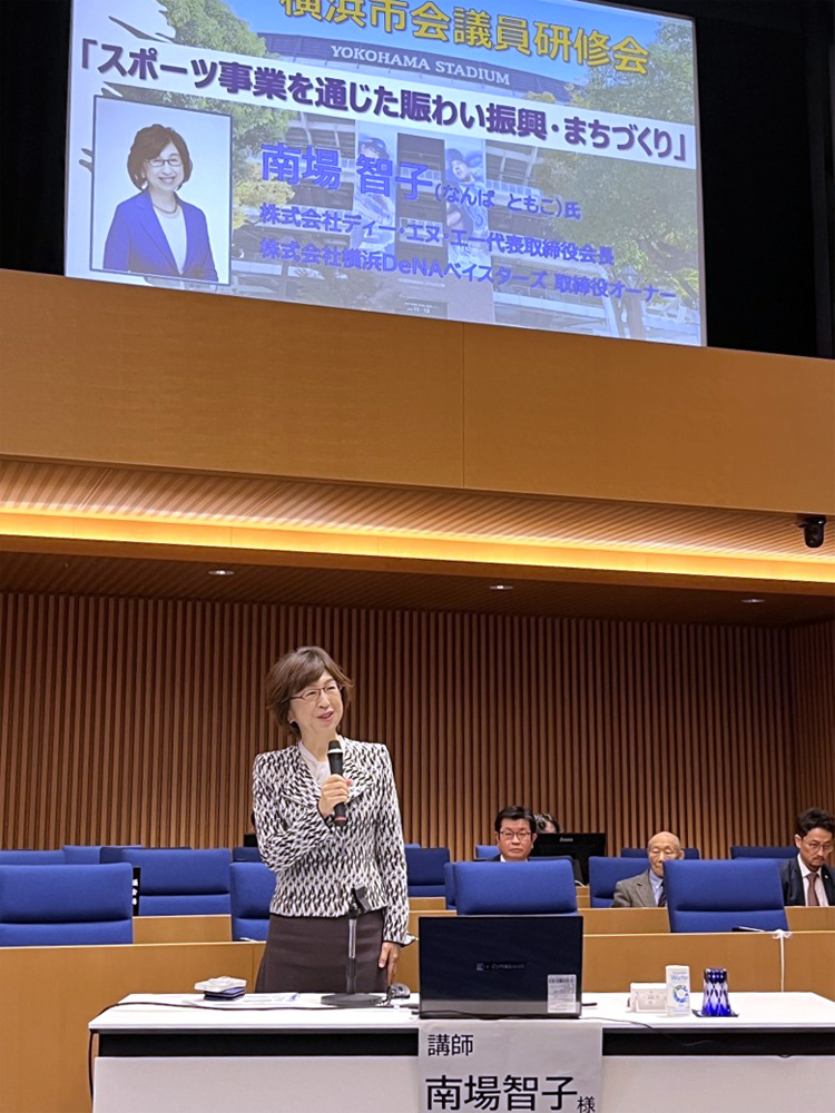 横浜DeNAベイスターズの取締役オーナーである南場智子氏から「スポーツ事業を通じた賑わい振興・まちづくり」とのテーマで講演がありました。