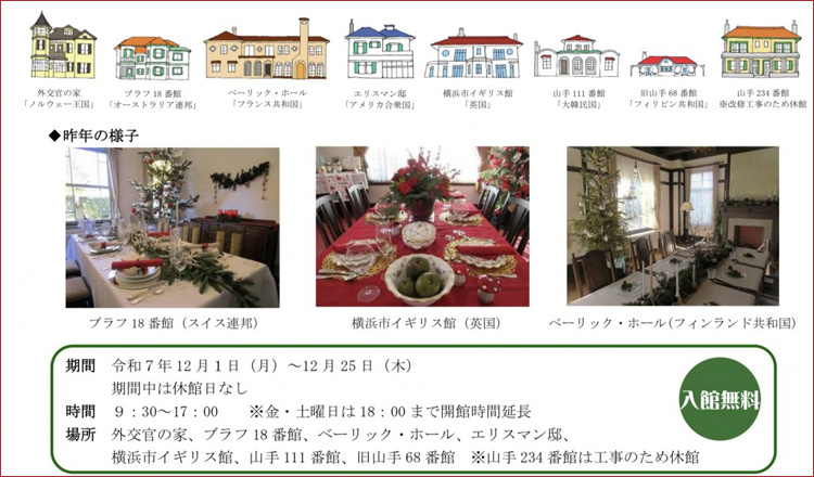 横浜山手に点在する西洋館7館で、それぞれ国を1つとりあげ、クリスマス装飾とともに、その国の文化を紹介しています。